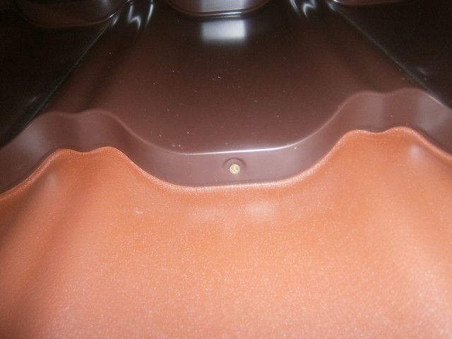 Саморізи знаходиться в зоні мінімального попадання дощової води , місця скручування модулів откалиброванны і розкриті заводською фарбою . Загин кромки листа надає модулю і покрівлі жорсткість і монолітність.Що забезпечує довгий термін служби даної черепиці, у порівнянні з традиційним свердлінням металочерепиці саморізом (залишає дрібну стружку на покрівлі).