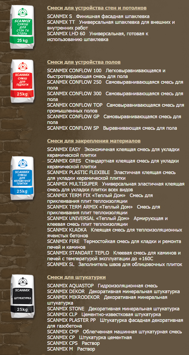 SCANMIX® Сучасні сухі суміші — багатокомпонентні спеціалізовані системи, у яких, крім мінеральної речовини-зв'язувальної, й заповніть, міститься комплекс хімічних добавок, що забезпечує необхідні властивості реакцій суміші, які регулюють швидкість схоплювання та затвердіння й забезпечують необхідні фізико-механічні властивості розчину після затвердіння. Сучасні сухі суміші SCANMIX® становлять групу допоміжних будівельних матеріалів зі спеціалізованими властивостями, які використовуються під час виконання будівельних робіт і для оброблення приміщень (текстурні покриття, порошкові фарби, «рідкі шпалери» тощо).