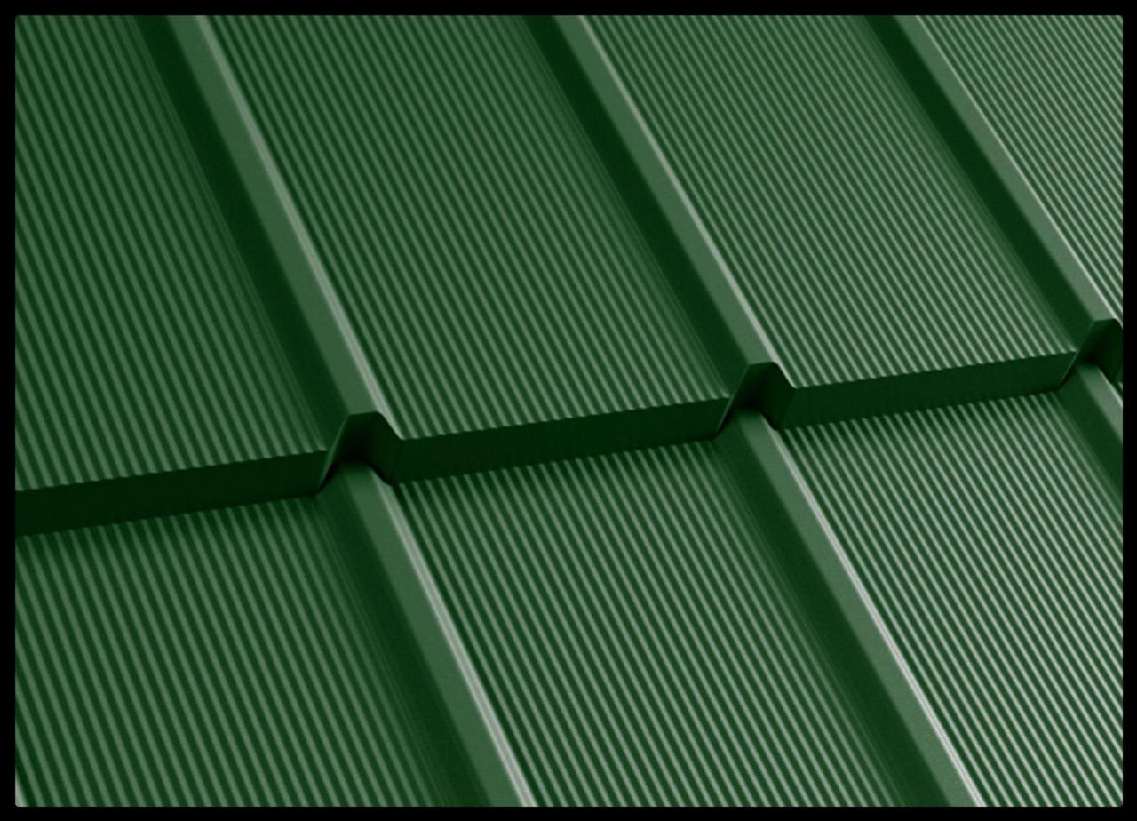 Вона унікальна завдяки своєму оригінальному дизайну, отриманому переважно завдяки використанню численних профілів. Перше, що впадає в око — це трапецієподібні форми, що відокремлюють плоскі частини панелі. Завдяки їм на даху створюється характерний малюнок «шоколадних плиток», який має «цільно» на даху. Металочерепиця TIGRA, крім трапецієподібного ребра, має додаткове нанопрофілювання. Таке рішення вже використовується нами для профільування покрівельних фальцевих панелей. Профільування хвиль металочерепиці ТИГРА настільки невеликі, що здалеку вони мають вигляд рівної поверхні, але одночасно зміцнюють панель, покращуючи її жорсткість. Довжина тайлу 350 мм.
